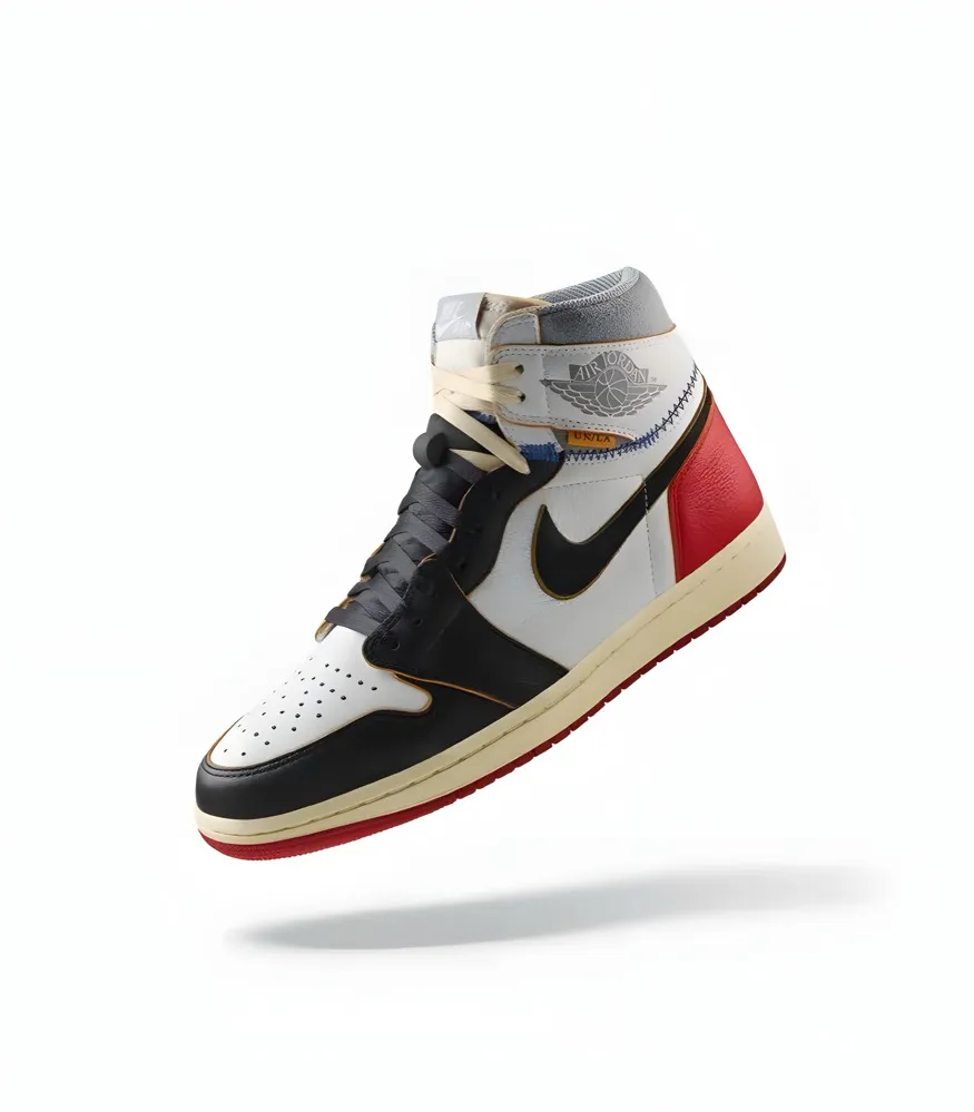 The Air Jordan 1 Retro High Union Los Angeles “Black Toe” reimagines the classic silhouette with a vintage-inspired twist. Part of Union LA’s 2018 collaboration with Jordan Brand, this sneaker fuses elements from iconic AJ1 colorways into one seamless design. Featuring a white leather base with black overlays, varsity red heel accents, exposed foam tongue, and blue zig-zag stitching, the shoe carries a retro “Frankenstein” aesthetic. The pre-yellowed midsole adds an aged look, while the signature yellow “UN/LA” tag completes the collab’s unique touch.