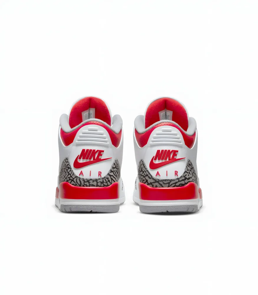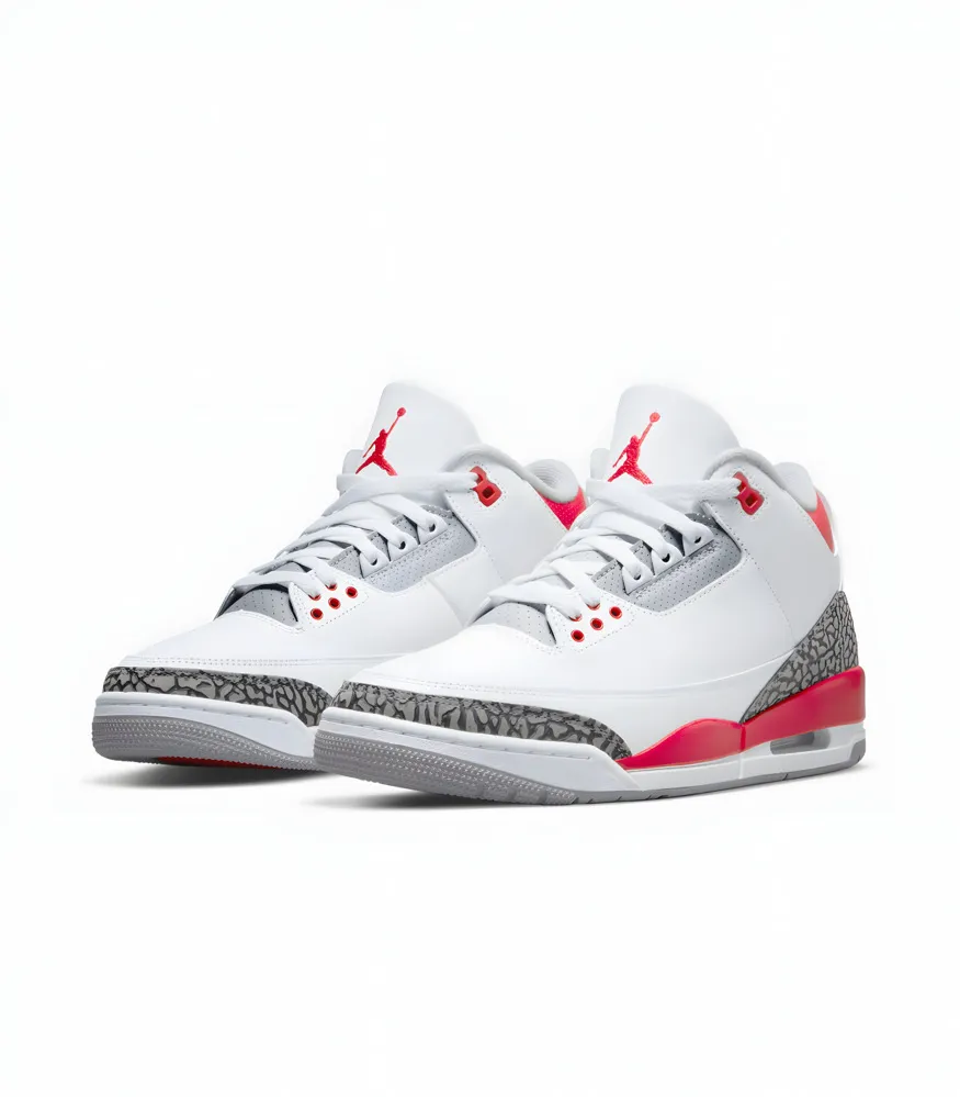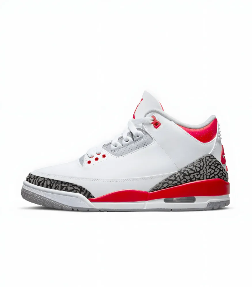 The Air Jordan 3 Fire Red brings back the iconic colorway that set sneaker culture on fire. With its bold red accents, black leather, and elephant print overlays, this classic silhouette stands out in any collection. Featuring the iconic Jumpman logo and a visible Air unit in the heel, the Fire Red 3s combine timeless style with signature Jordan performance, making it a must-have for any true sneakerhead.