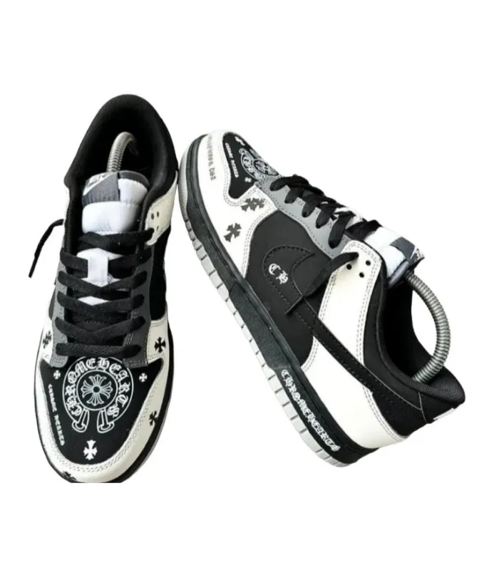 The Nike Dunk Low Chrome Hearts Black & White gives the iconic Dunk silhouette a luxury streetwear makeover. Featuring a premium leather construction in a classic black-and-white palette, this custom-inspired design is accented with Chrome Heartsโ signature cross motifs and metal hardware detailing. A bold blend of sneaker culture and high-fashion edge, itโs a statement piece for collectors and style enthusiasts.